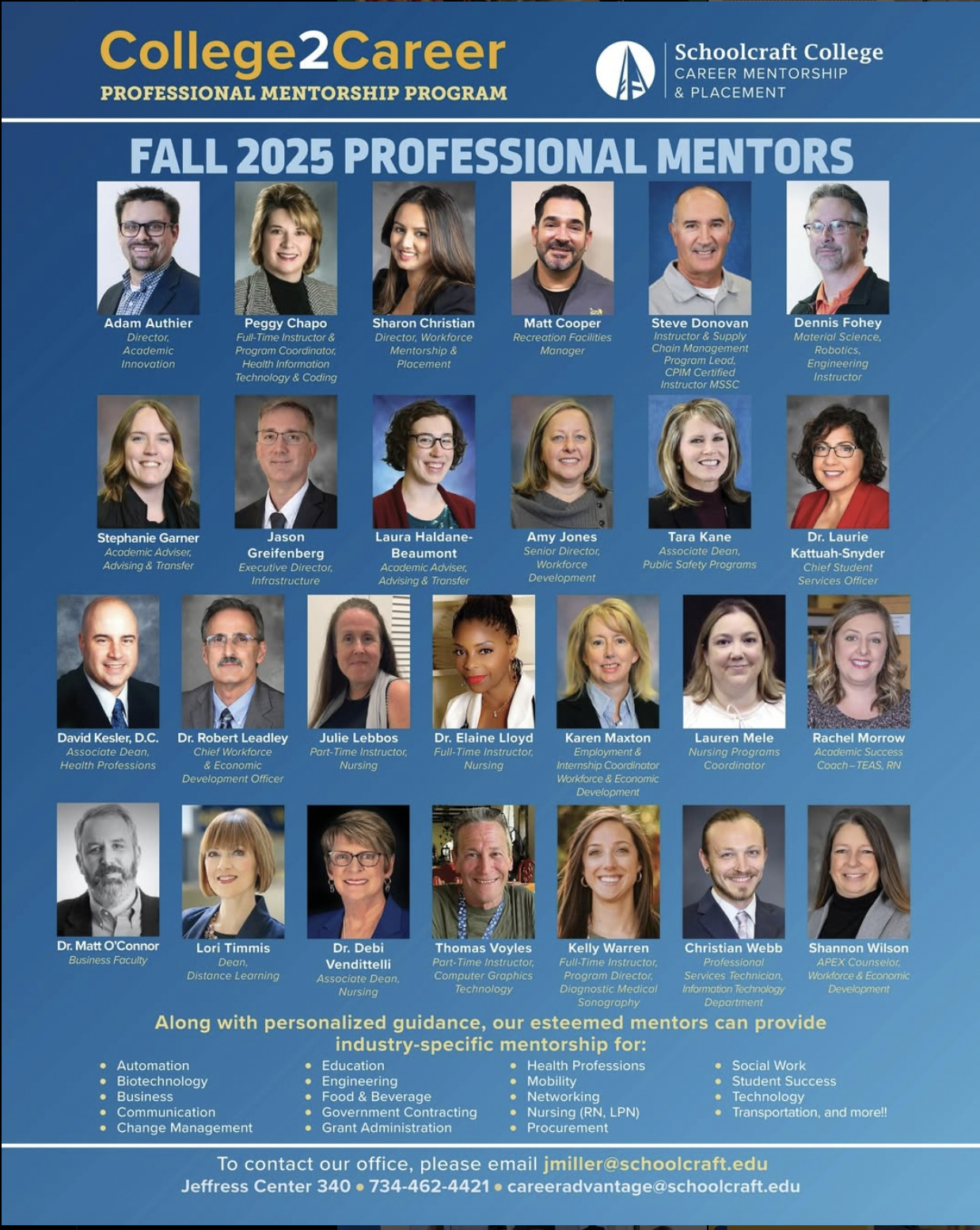 The program is open to all current students of Schoolcraft College. Mentors are faculty members from the same major as the student, so the guidance is tailored and directly relevant to their field of study. Each major has its own team of volunteer faculty who help students navigate opportunities and career goals.